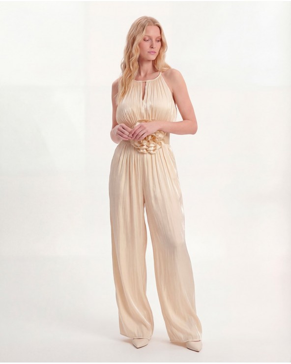 Tuta con scollo halter e bretelle sottili. Vita elasticizzata. Cintura elasticizzata con applicazione di fiore abbinata tono su tono. Chiusura...
