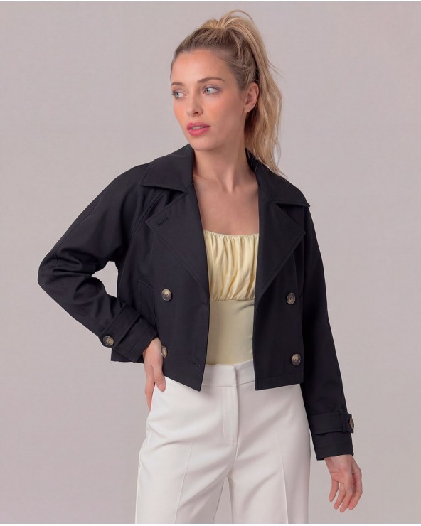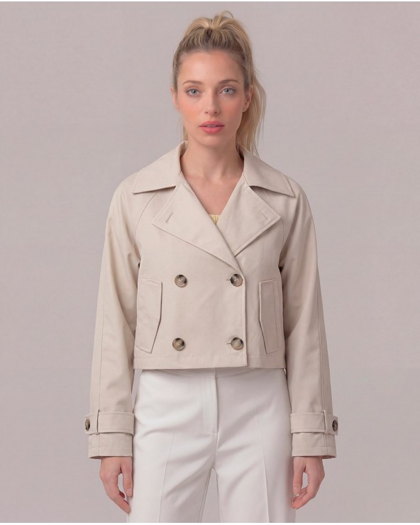 Trench cropped con colletto a revers e maniche lunghe con polsino. Chiusura frontale doppiopetto con bottoni a contrasto. Fodera interna. Tasche...