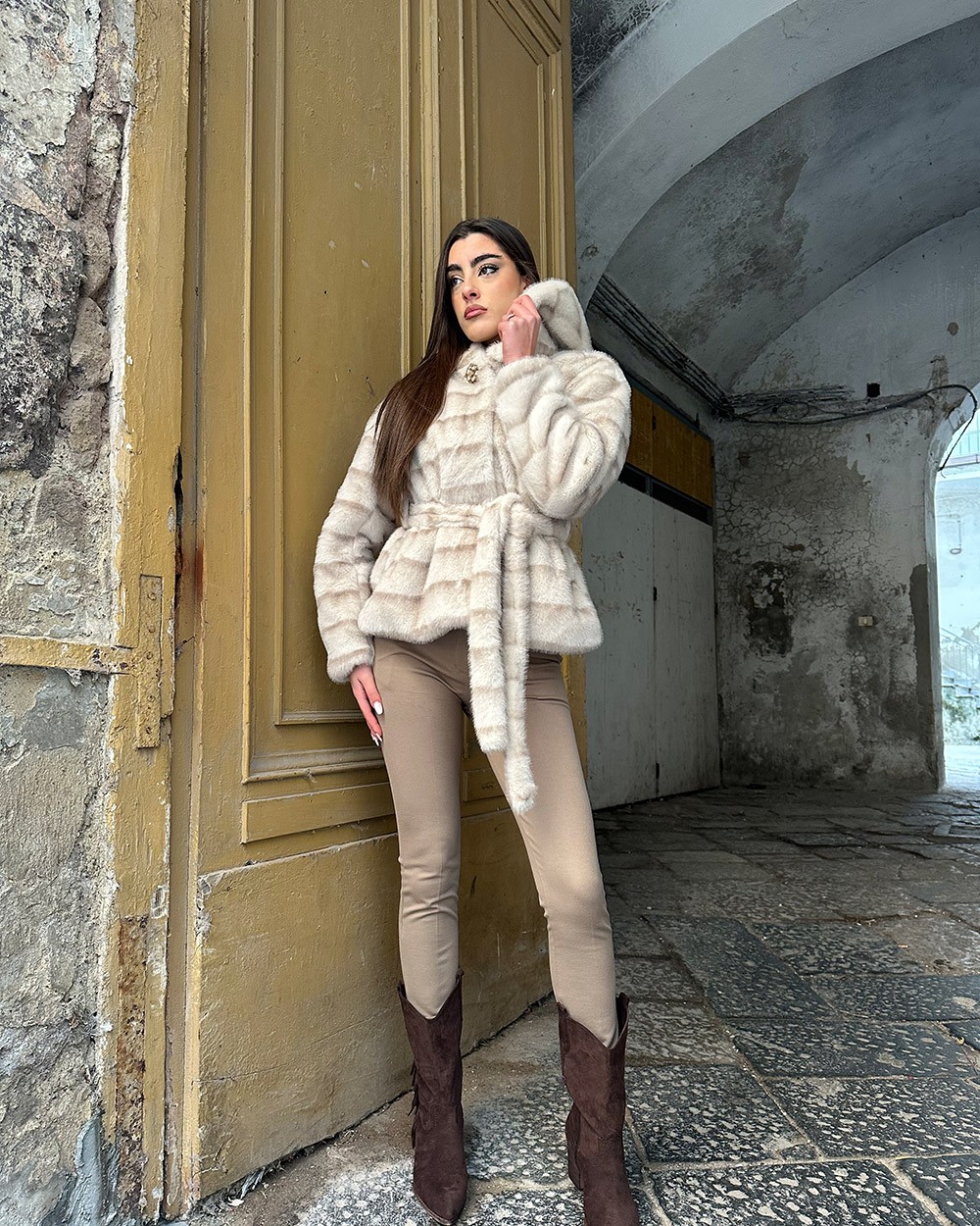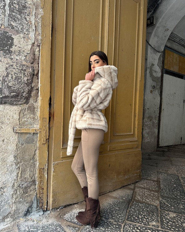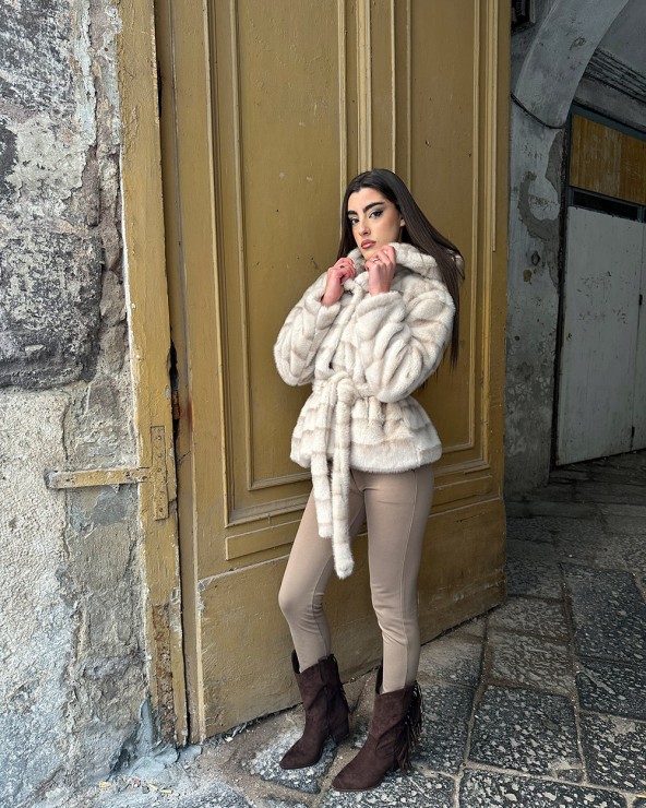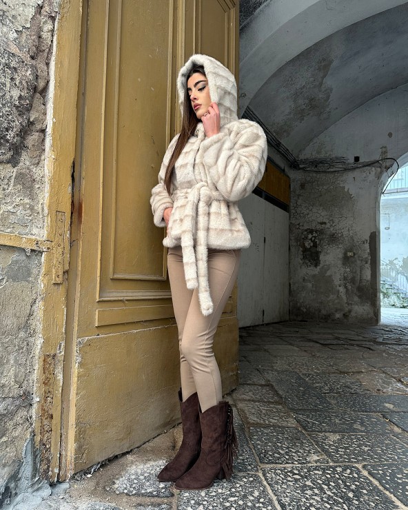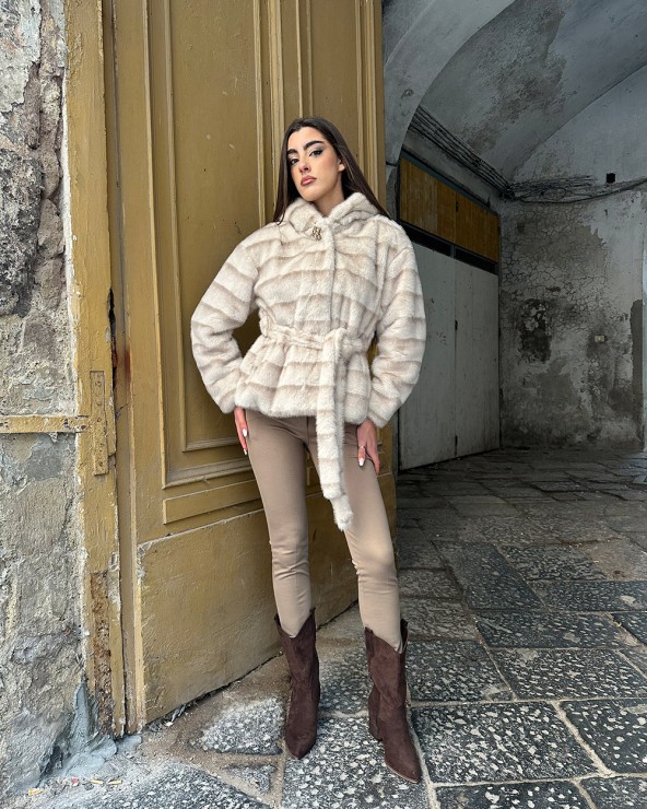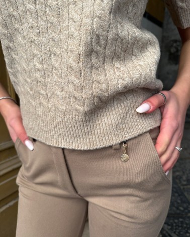 Maglia con collo rotondo e mezze maniche. Lavorazione a treccia. Finiture a coste. Dettaglio di perline sul collo.