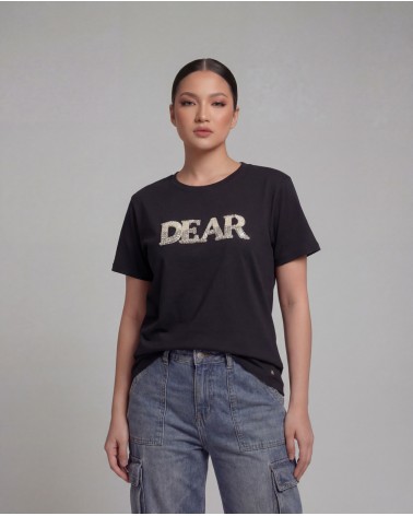 T-shirt con collo rotondo e maniche corte. Dettaglio di applicazione di paillettes e strass.