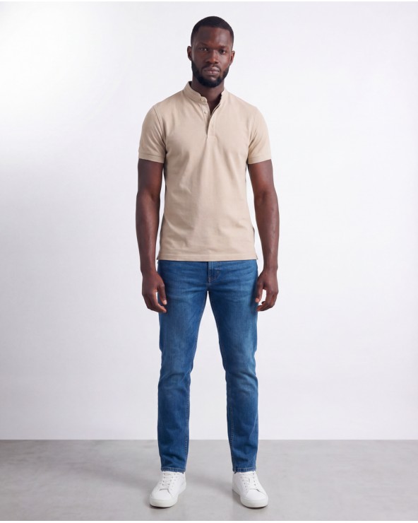 Maglietta con collo rotondo e maniche corte. Chiusura sulla parte anteriore con bottoni.