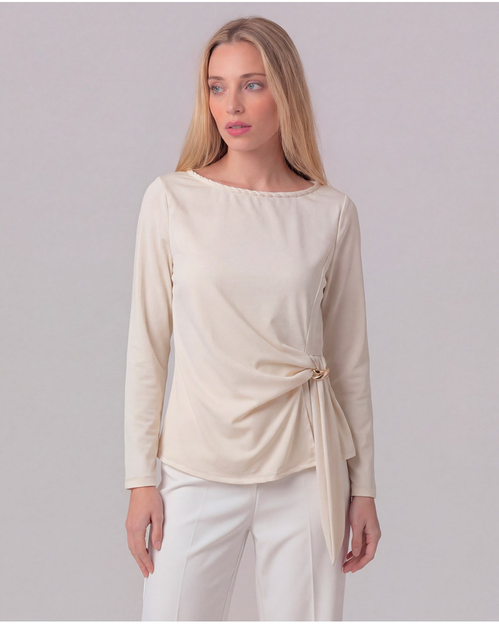 Maglia con collo rotondo e maniche lunghe. Tessuto elasticizzato. Dettaglio metallico sul davanti con incrocio e spacco.
