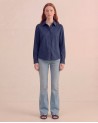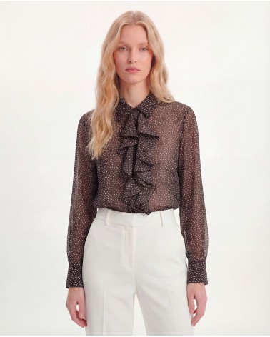 Camicia morbida a pois. Chiusura frontale con bottoni e maniche lunghe. Dettaglio di volant.