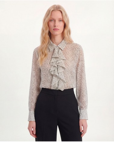 Camicia morbida a pois. Chiusura frontale con bottoni e maniche lunghe. Dettaglio di volant.