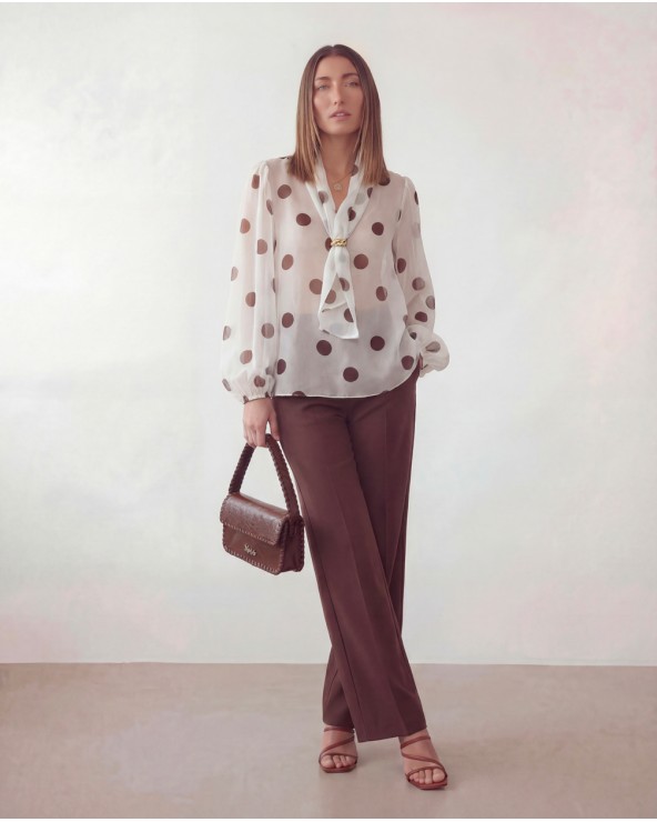 Blusa trasparente a pois con scollo a v e maniche lunghe a palloncino. Dettaglio di fiocco con elemento metallico.