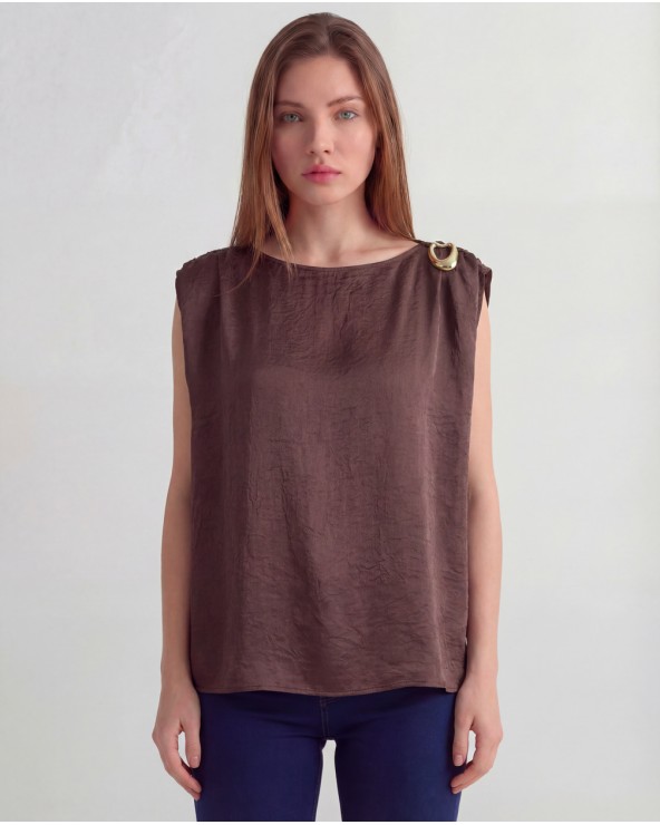 Blusa morbido effetto raso. Collo rotondo e giromaniche. Dettaglio di spilla gioiello inclusa.
