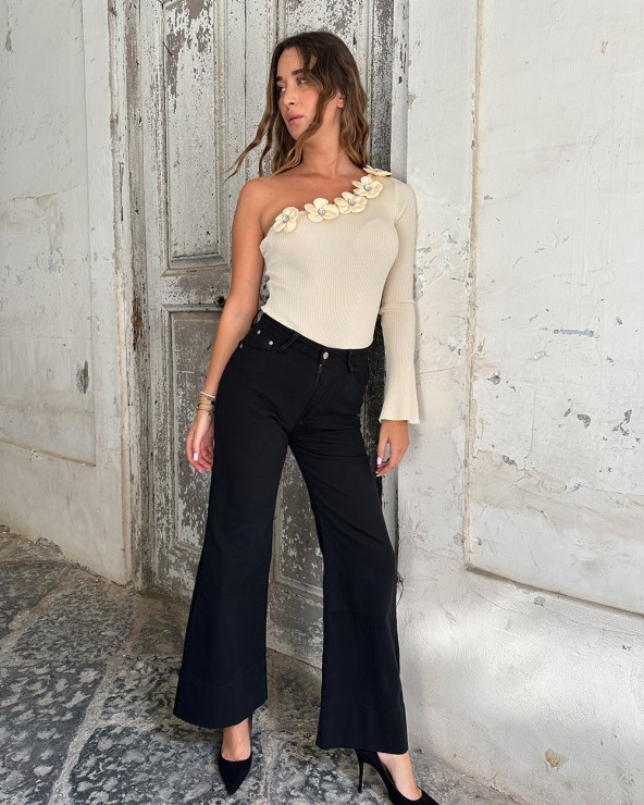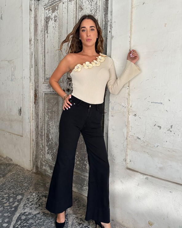 Body a coste con scollo asimmetrico e manica lunga a campana. Chiusura sulla parte inferiore con bottoni a pressione. Dettaglio di applicazioni di fiori e strass.