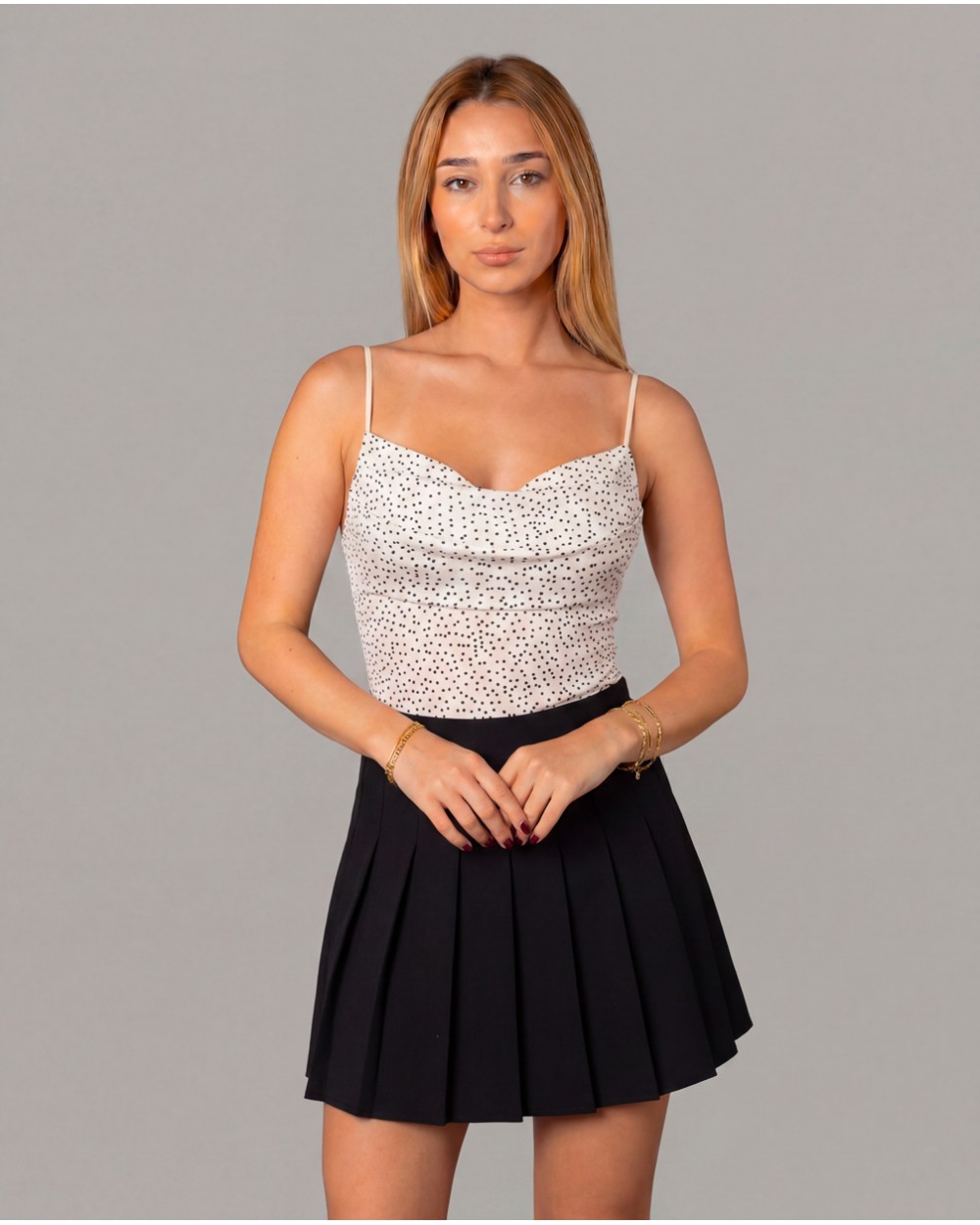 Body a pois con scollo quadrato e bretelle sottili regolabili. Chiusura sulla parte inferiore con ganci. Dettaglio di arricciature.