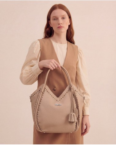 Borsa con struttura rigida. Manici a spalla. Chiusura con cerniera. Tracolla regolabile e removibile. Interno foderato con tasca. Dettaglio di ciondoli.
