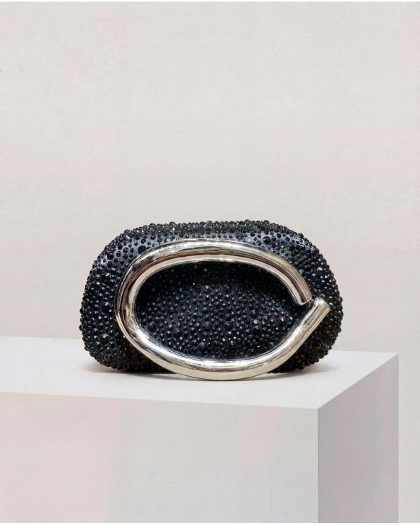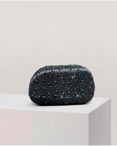 Pochette effetto raso. Tracolla metallica removibile. Chiusura con calamita. Interno foderato. Dettaglio metallico. Applicazione di strass.