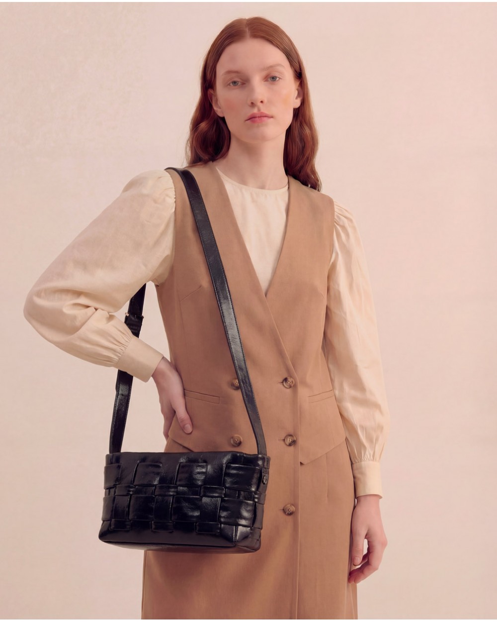 Borsa mini con trama intrecciata. Struttura rigida. Manico a spalla e tracolla regolabile e removibile. Chiusura con cerniera. Interno foderato con tasca.