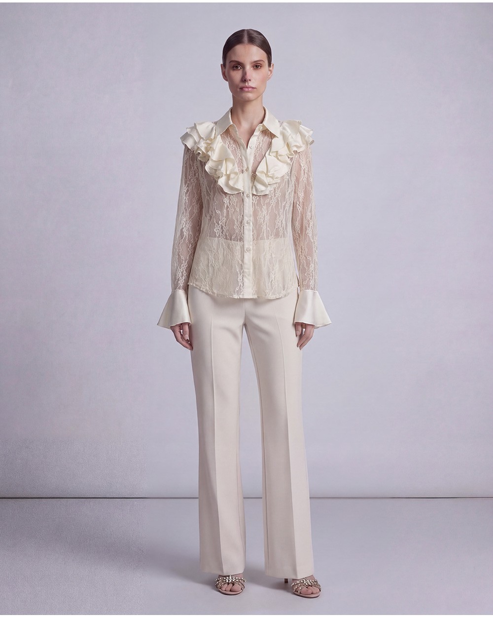 Camicia in pizzo con colletto a revers e maniche lunghe. Chiusura frontale con bottoni. Rouche sul davanti. Dettaglio di parti in raso.