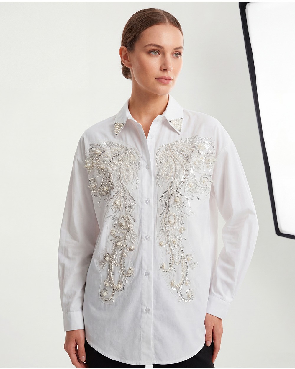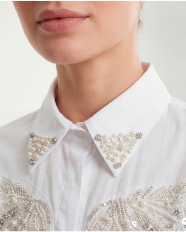 Camicia oversize. Colletto a revers e maniche lunghe con bottone sul polsino. Chiusura frontale con abbottonatura. Dettaglio di applicazione di perline e strass.