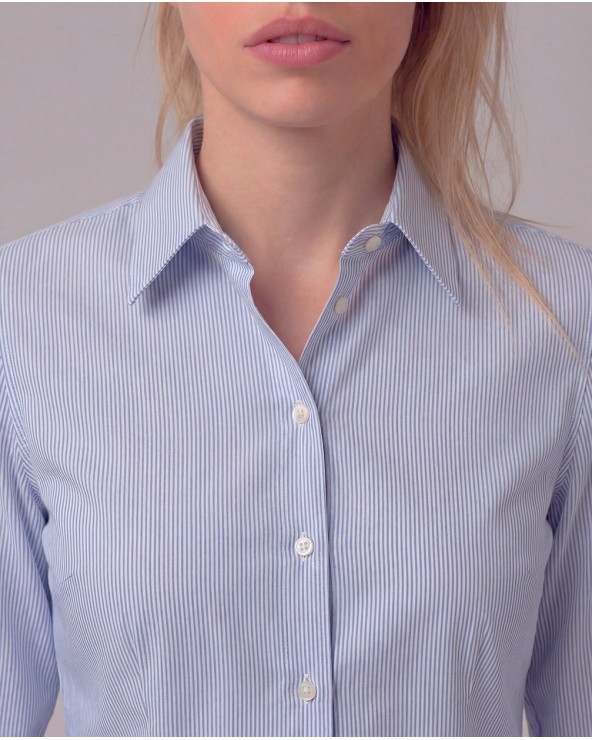 Camicia elasticizzata con struttura a righe. Colletto a revers e maniche lunghe con bottone sul polsino. Chiusura frontale con abbottonatura. Dettaglio di pinces.