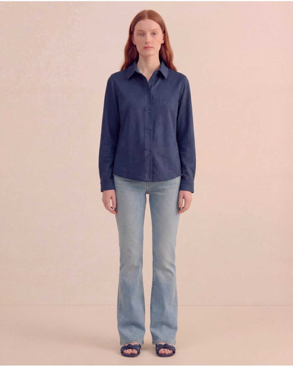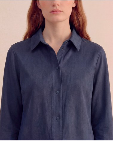Camicia in ecodaino con colletto a revers e maniche lunghe con bottone sul polsino. Chiusura frontale con bottoni a pressione. Tasche laterali.