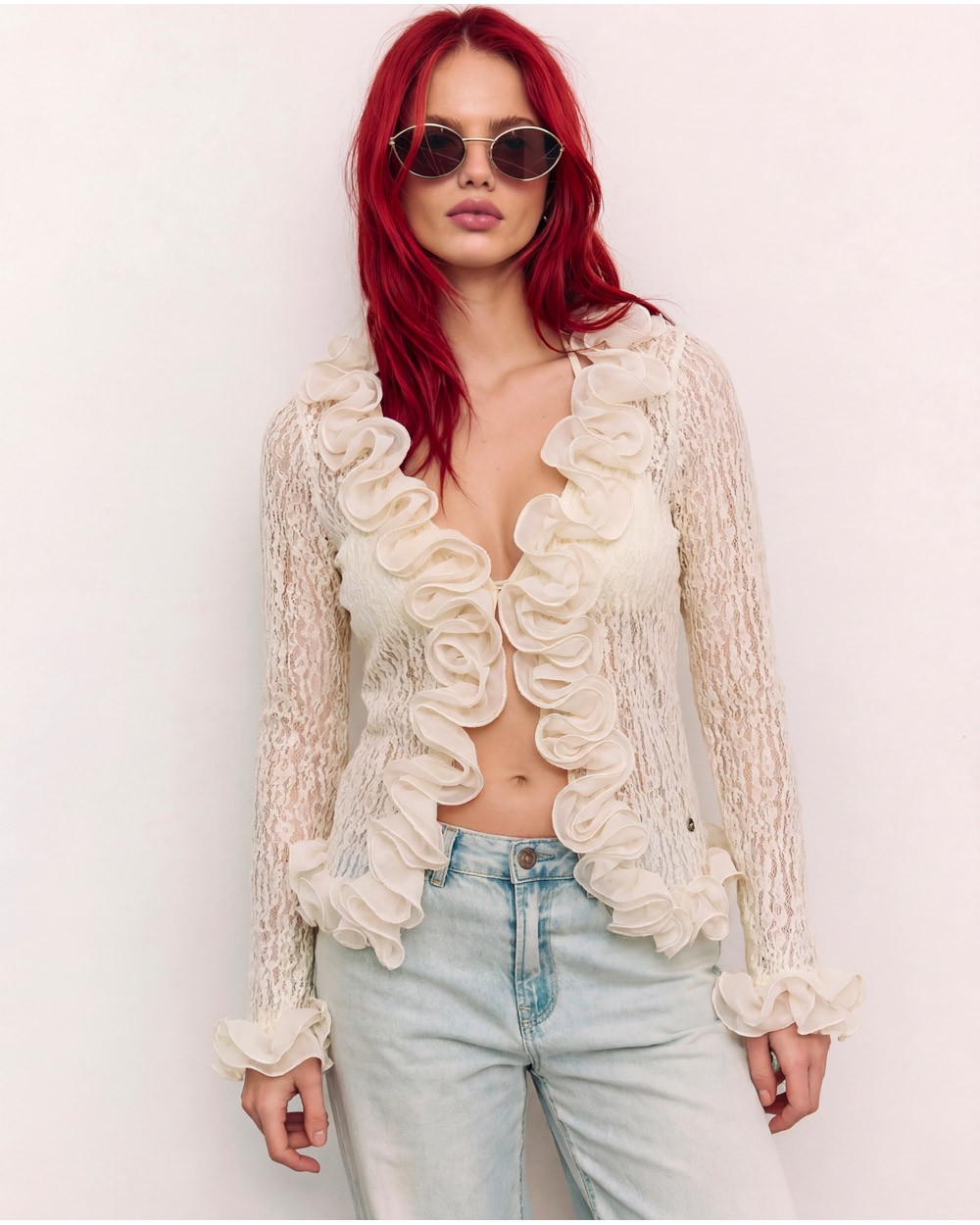 Cardigan semitrasparente con scollo a v e maniche lunghe. Dettaglio di volant. Chiusura frontale con bottoni.