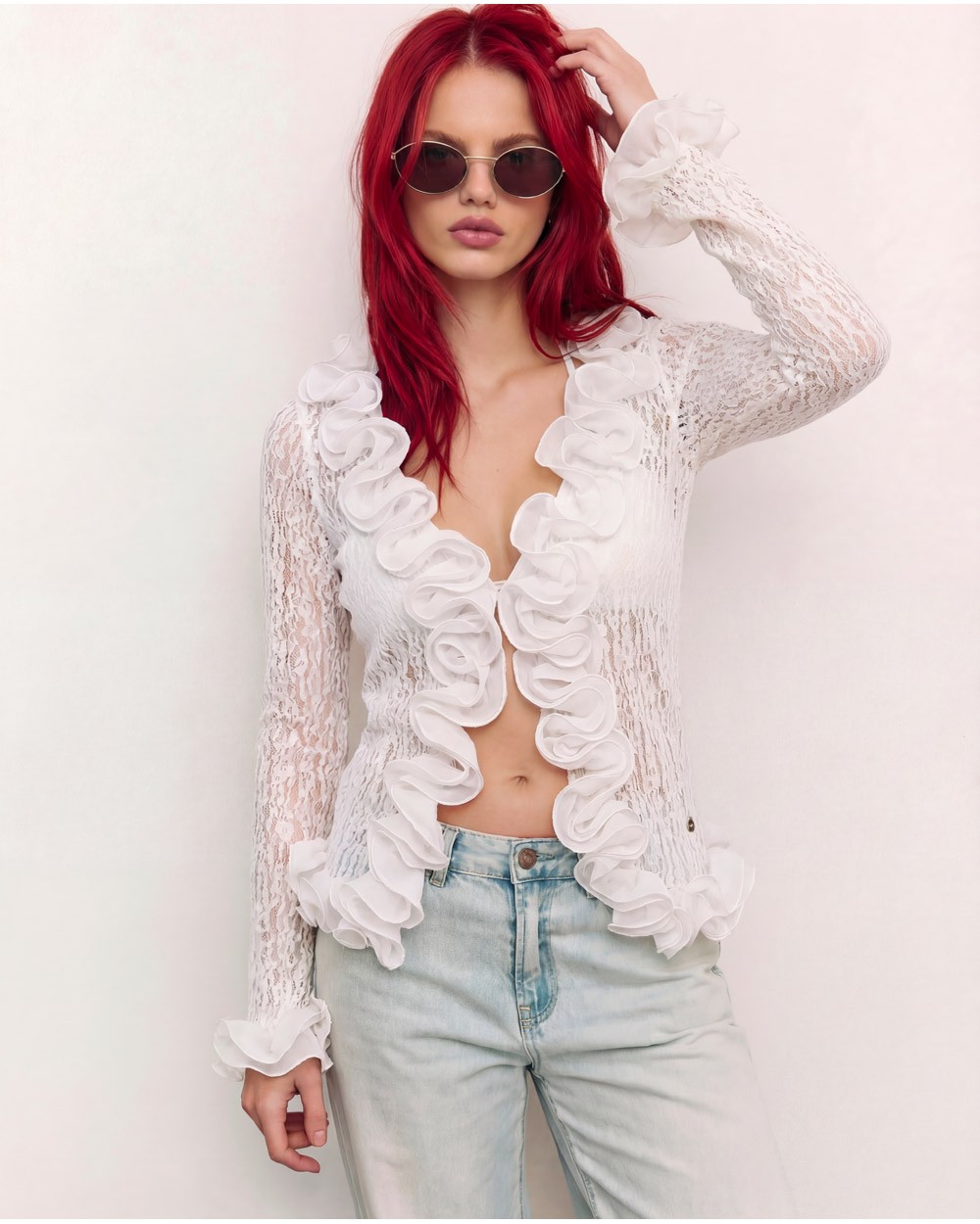 Cardigan semitrasparente con scollo a v e maniche lunghe. Dettaglio di volant. Chiusura frontale con bottoni.