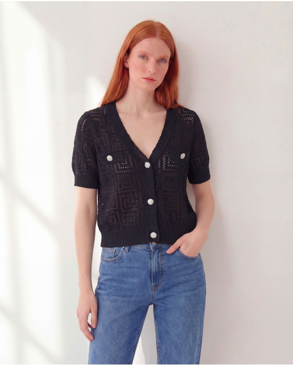 Cardigan traforato con scollo a v e maniche corte. Finiture a coste. Chiusura frontale con bottoni gioiello. Effetto lurex.