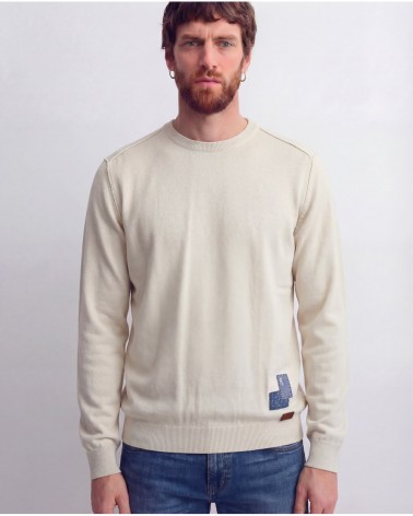 Pullover con collo rotondo e maniche lunghe. Finiture a coste. Dettaglio di toppe sul davanti a contrasto.