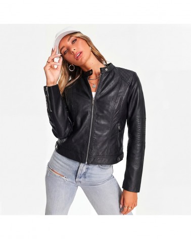 Giubbino in ecopelle con collo rotondo e bottone a pressione metallico. Chiusura frontale con cerniera metallica. Tasche anteriori sui fianchi.