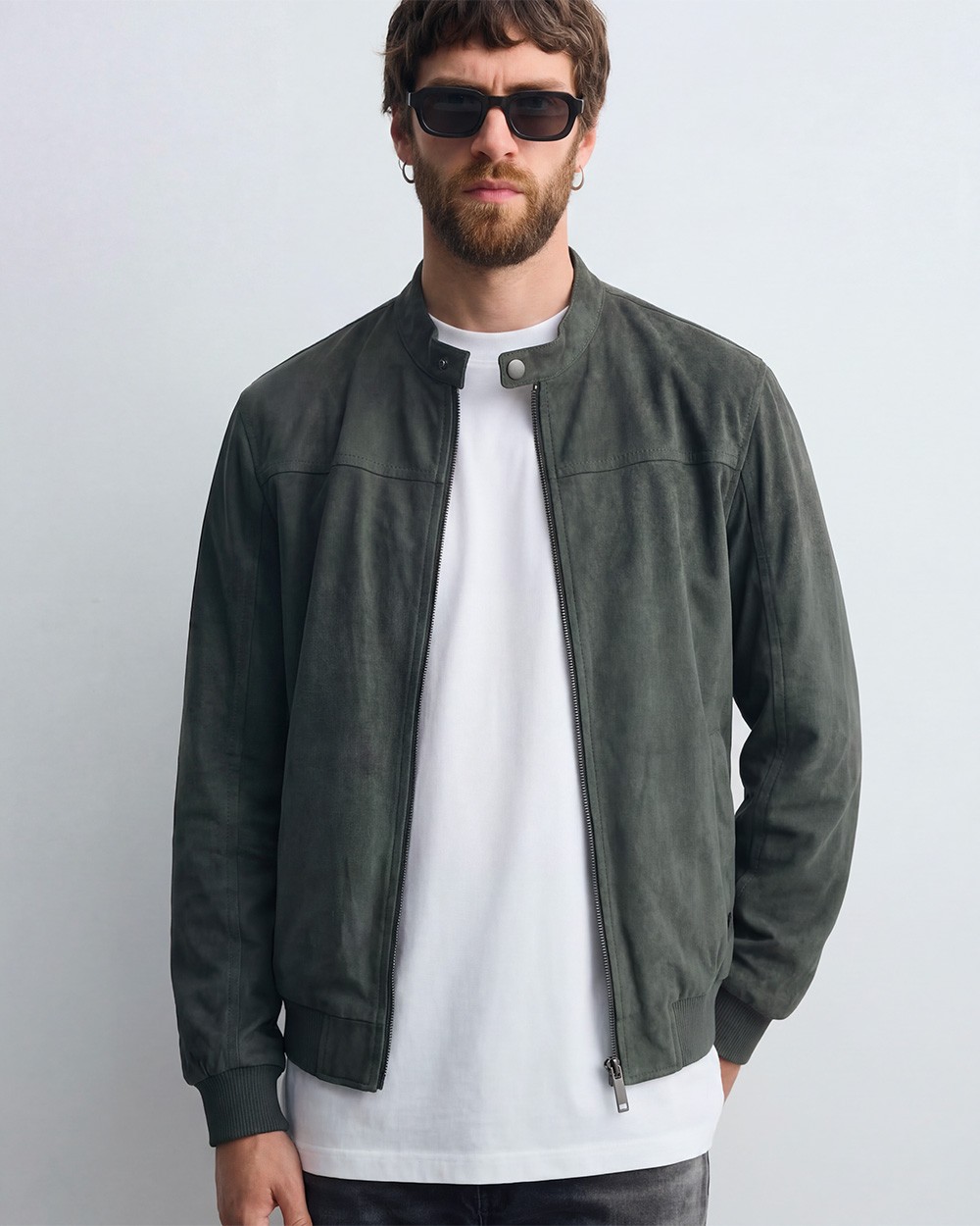 Giubbino traforato in ecodaino con collo rotondo. Chiusura frontale con cerniera metallica. Tasche anteriori sui fianchi con bottone a pressione. Presenta una tasca interna.