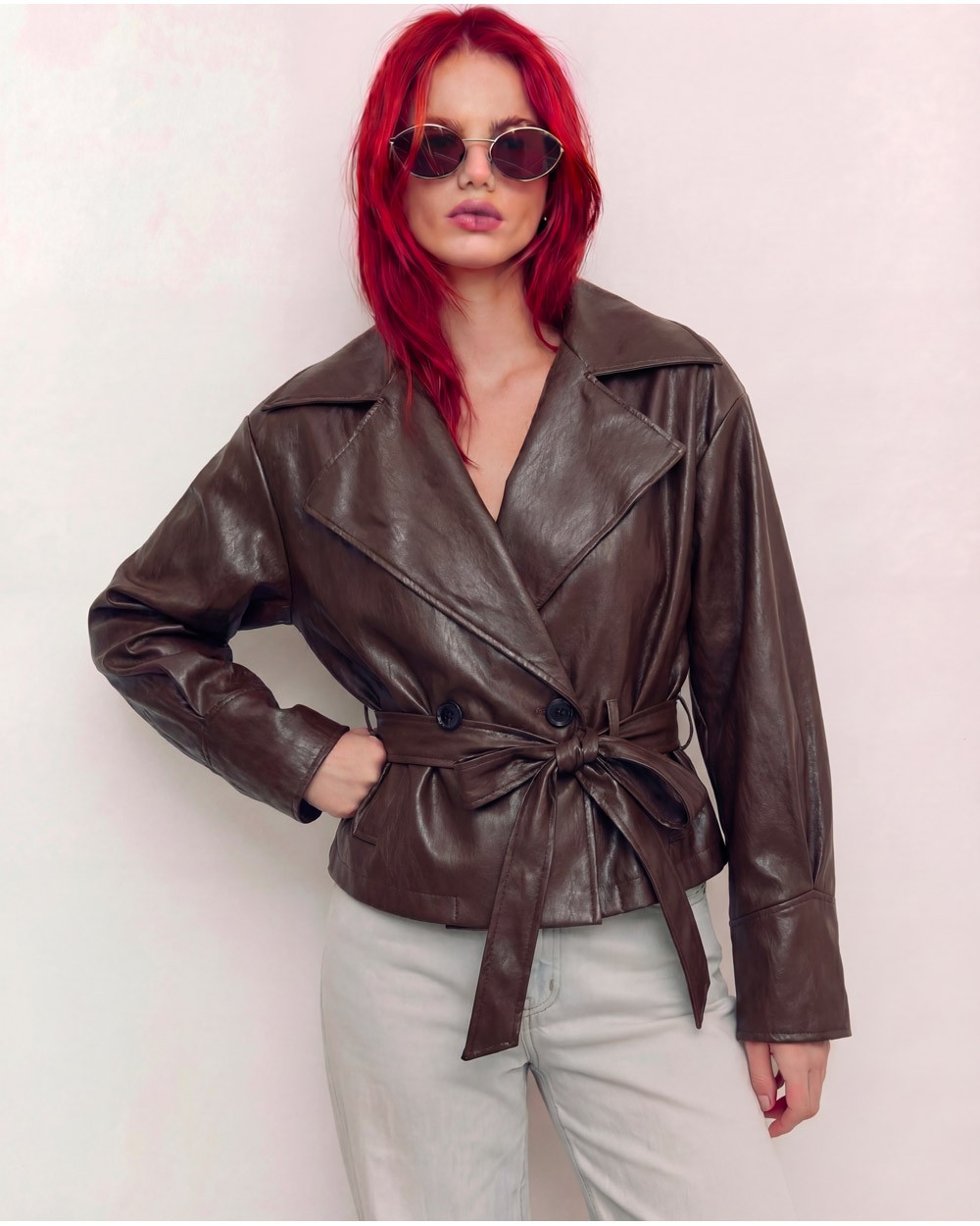 Giacca in ecopelle con colletto a revers e maniche lunghe. Chiusura frontale doppiopetto con bottoni a contrasto. Vita regolabile con cintura.