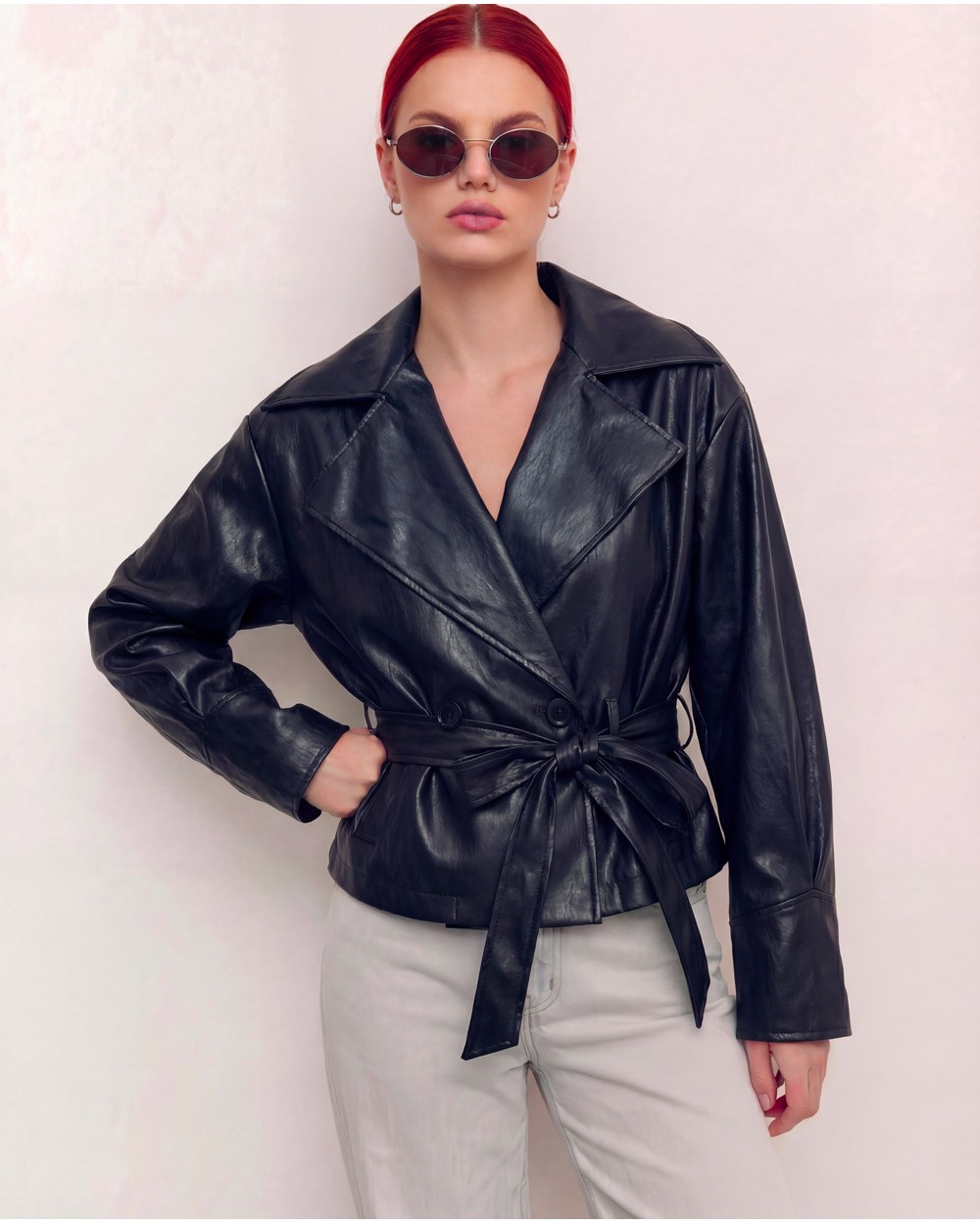 Giacca in ecopelle con colletto a revers e maniche lunghe. Chiusura frontale doppiopetto con bottoni a contrasto. Vita regolabile con cintura.