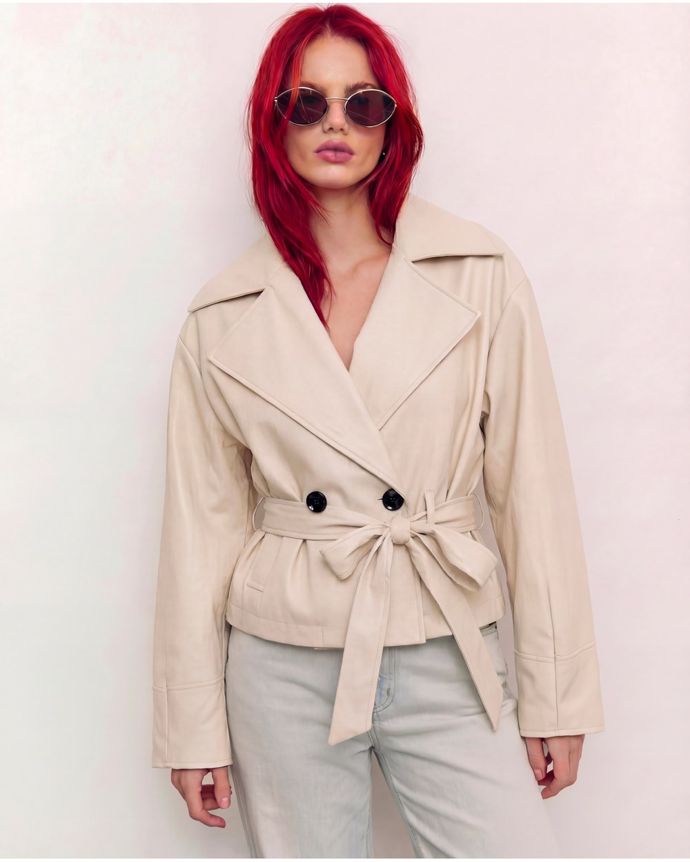 Giacca in ecopelle con colletto a revers e maniche lunghe. Chiusura frontale doppiopetto con bottoni a contrasto. Vita regolabile con cintura.