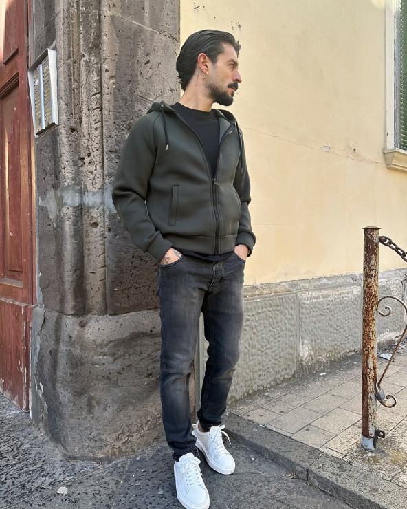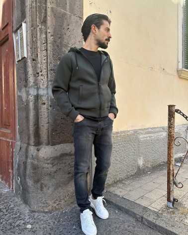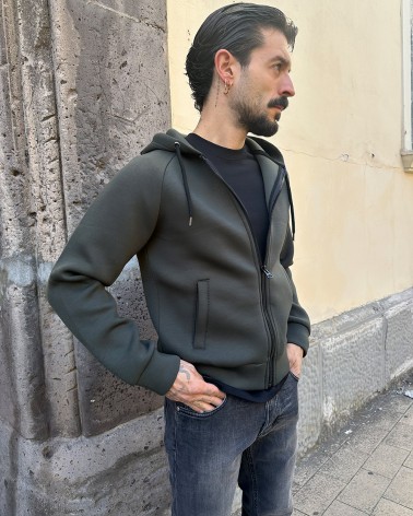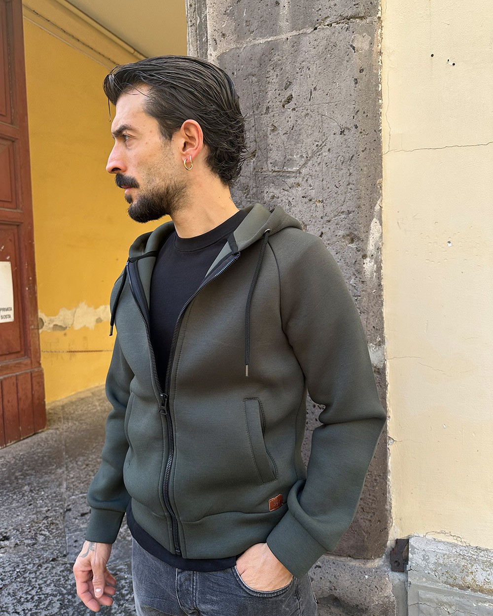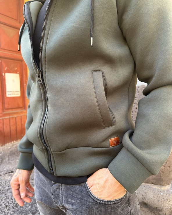 Felpa con tessuto tecnico. Cappuccio regolabile e maniche lunghe. Tasche laterali. Chiusura frontale con cerniera.