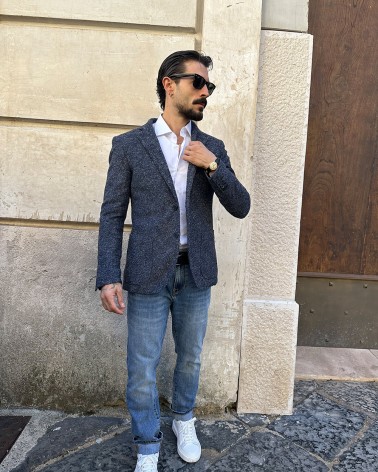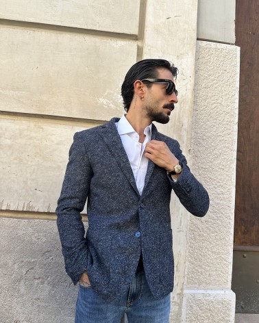 Giacca realizzata in  tessuto misto lana. Collo a revers e maniche lunghe con dettaglio di bottoni sul polsino. Tasche anteriori con toppa e sul petto a filetto. Tasche interne. Chiusura frontale con due bottoni. Spacchi sulla parte posteriore.