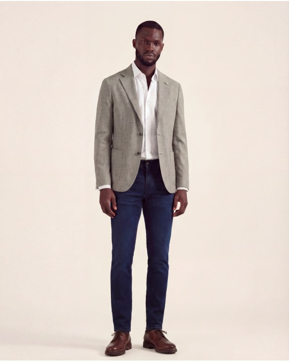 Giacca con collo a revers e maniche lunghe con dettaglio di bottoni sul polsino. Tasche anteriori con toppa e sul petto a filetto. Tasche interne. Chiusura frontale con due bottoni. Spacchi sulla parte posteriore. Pochette inclusa.