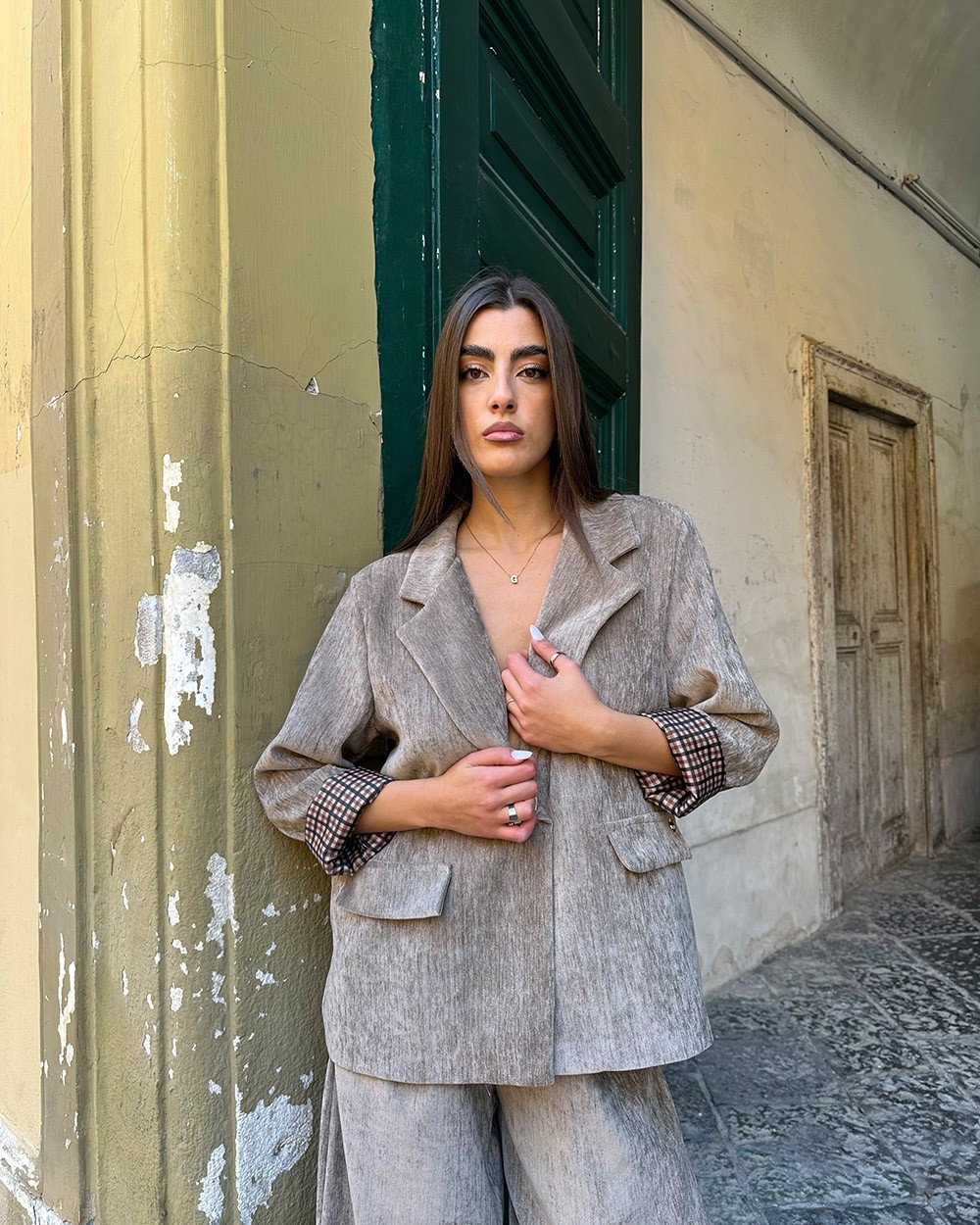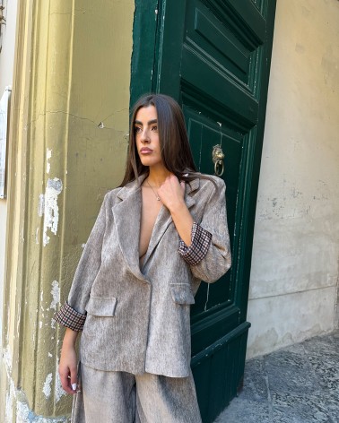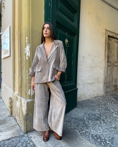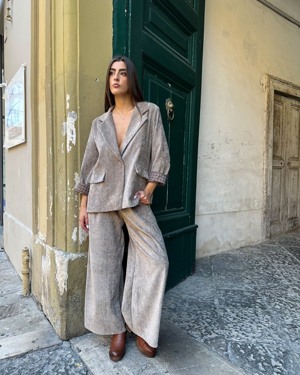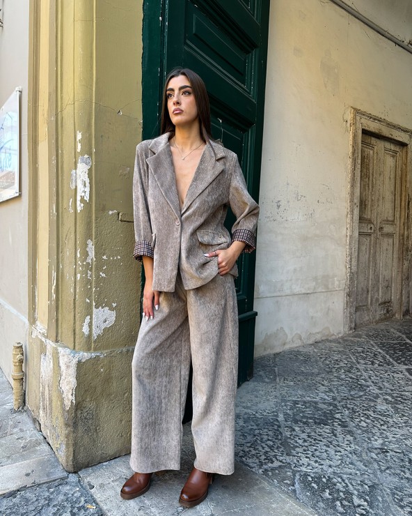 Giacca in velluto. Colletto a revers e maniche lunghe con spalle segnate. Chiusura frontale con un bottone. Fodera interna a contrasto. Finte tasche sul davanti.