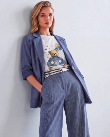 Giacca in tessuto elasticizzato. Colletto a revers e maniche lunghe. Chiusura frontale con un bottone a contrasto. Finte tasche anteriori con patta.