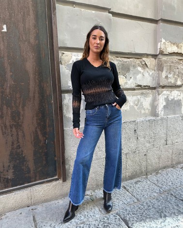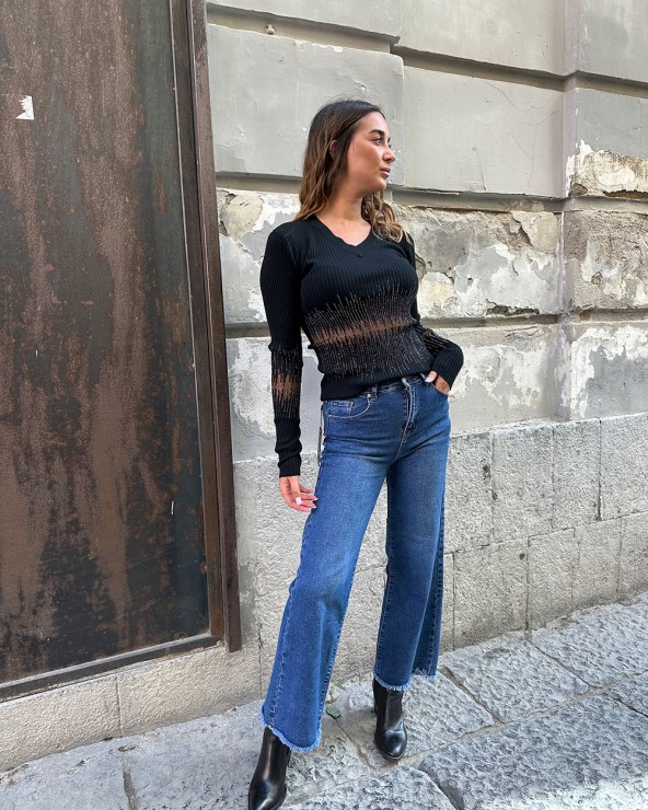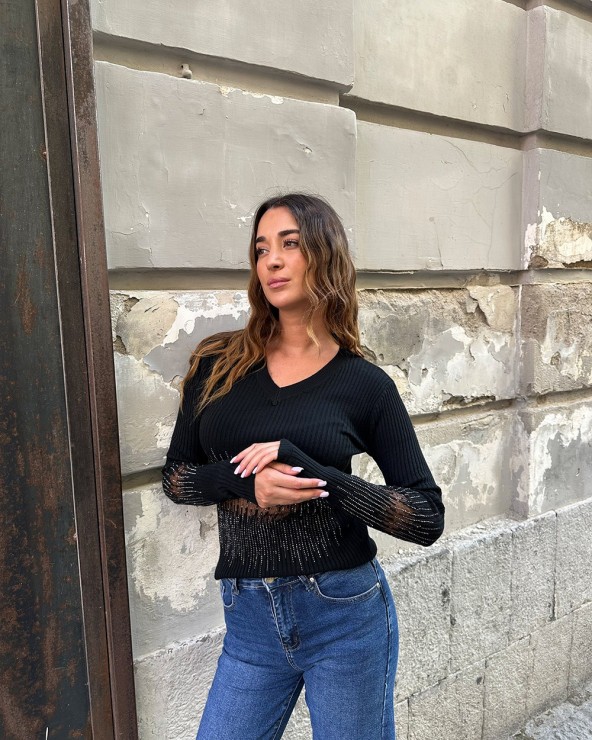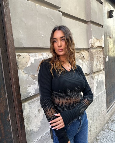 Maglia a coste con scollo a v e maniche lunghe. Dettaglio di trasparenze e strass.
