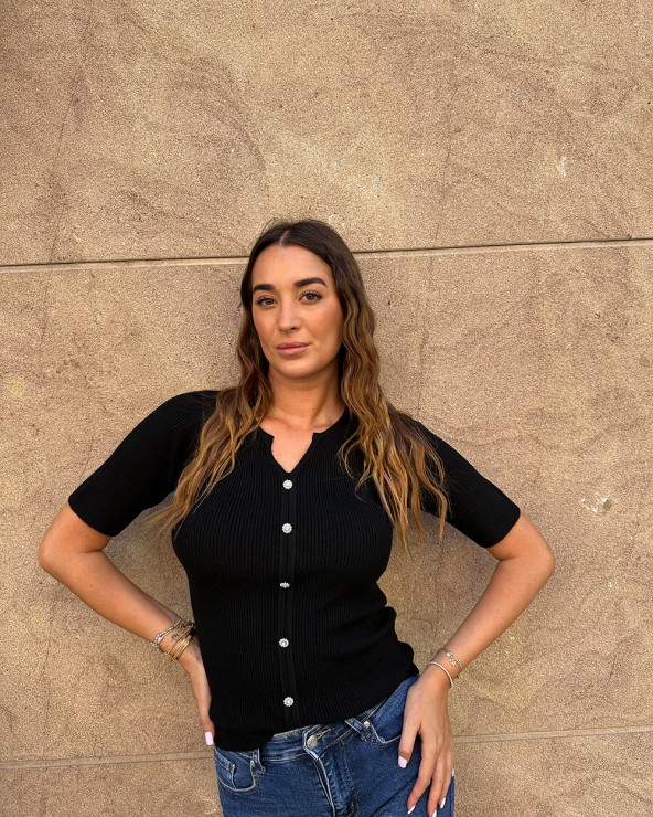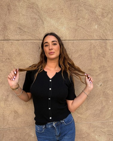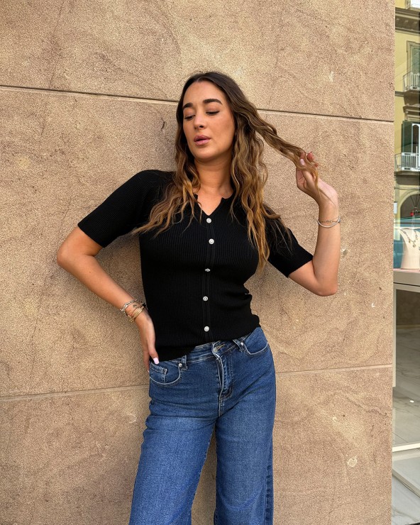 Maglia a coste con scollo a v e maniche corte. Dettaglio di finti bottoni gioiello.