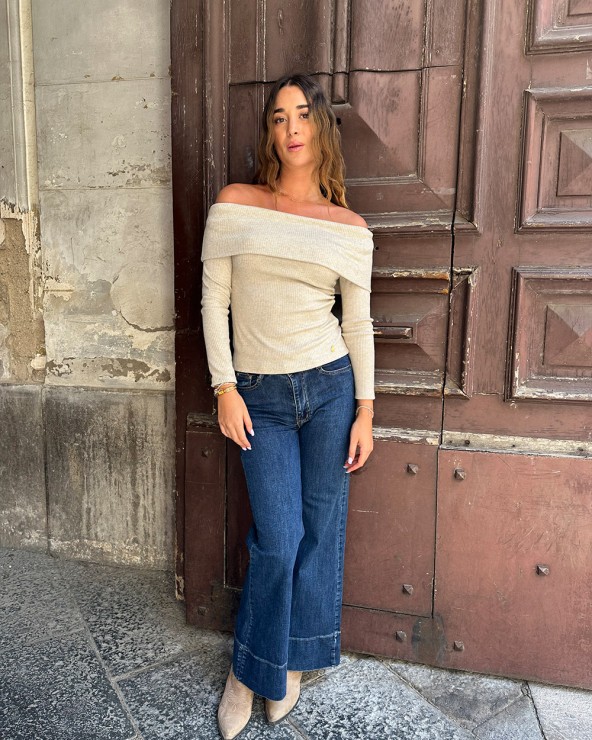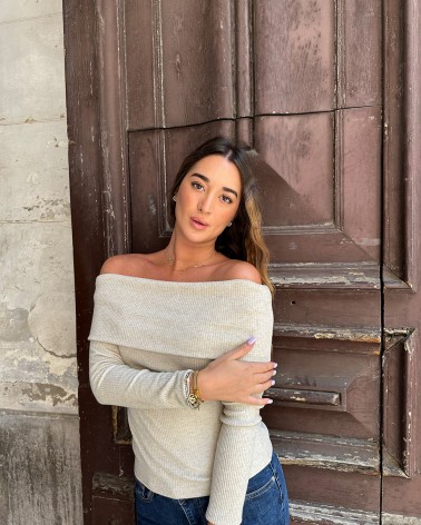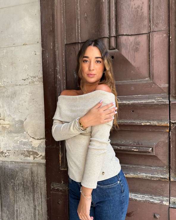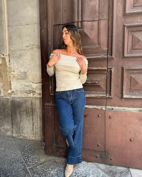 Maglia a coste effetto lurex. Scollo a barca e maniche lunghe. Dettaglio di bottoni metallici e arricciature.