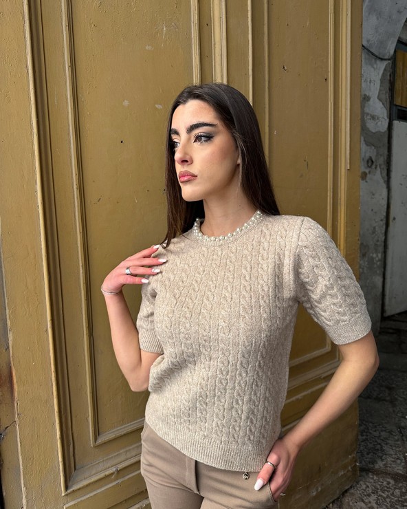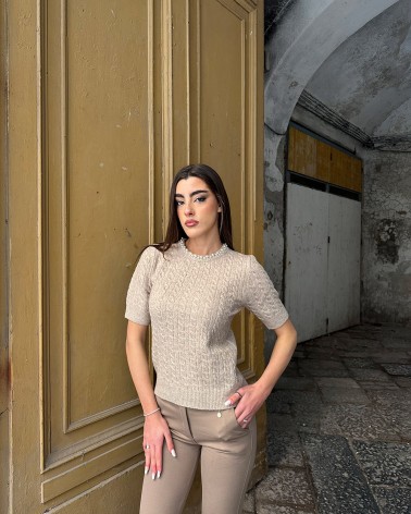 Maglia con collo rotondo e mezze maniche. Lavorazione a treccia. Finiture a coste. Dettaglio di perline sul collo.
