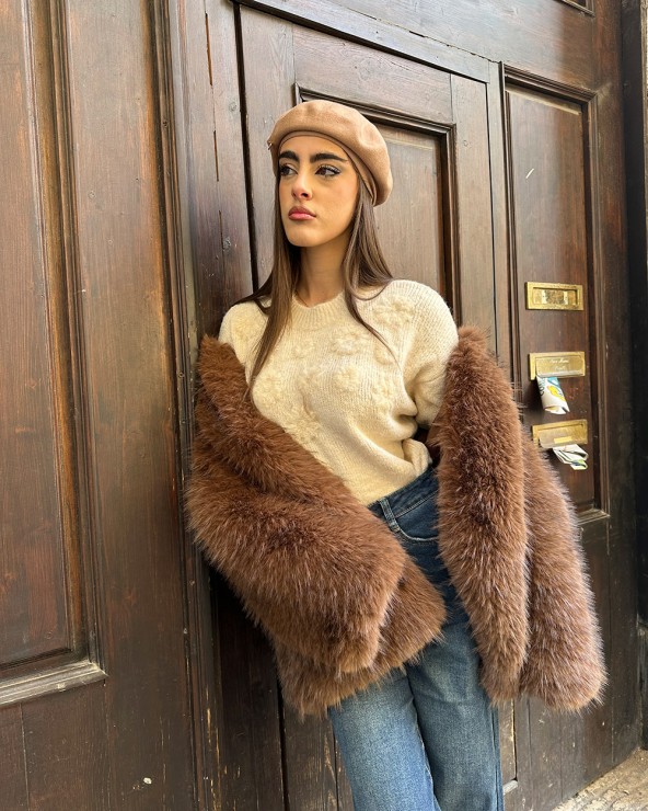 Maglia morbida con collo rotondo e maniche lunghe. Finiture a coste. Dettaglio di ricami.