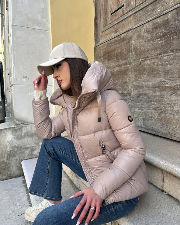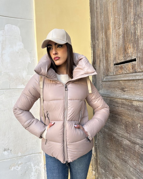 frontale con bottone e cerniera metallica. Dettaglio di cintura dello stesso tessuto....