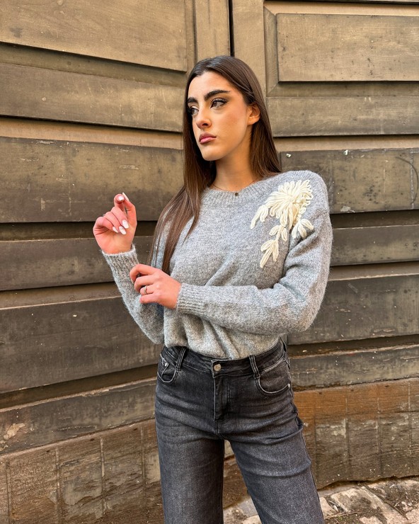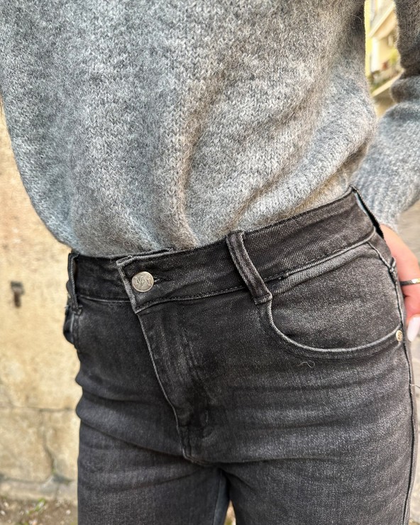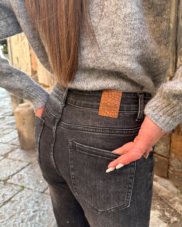 Jeans a zampa. Vita alta con cinque tasche. Chiusura
