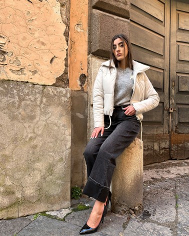 frontale con bottone e cerniera metallica. Dettaglio di cintura dello stesso tessuto....