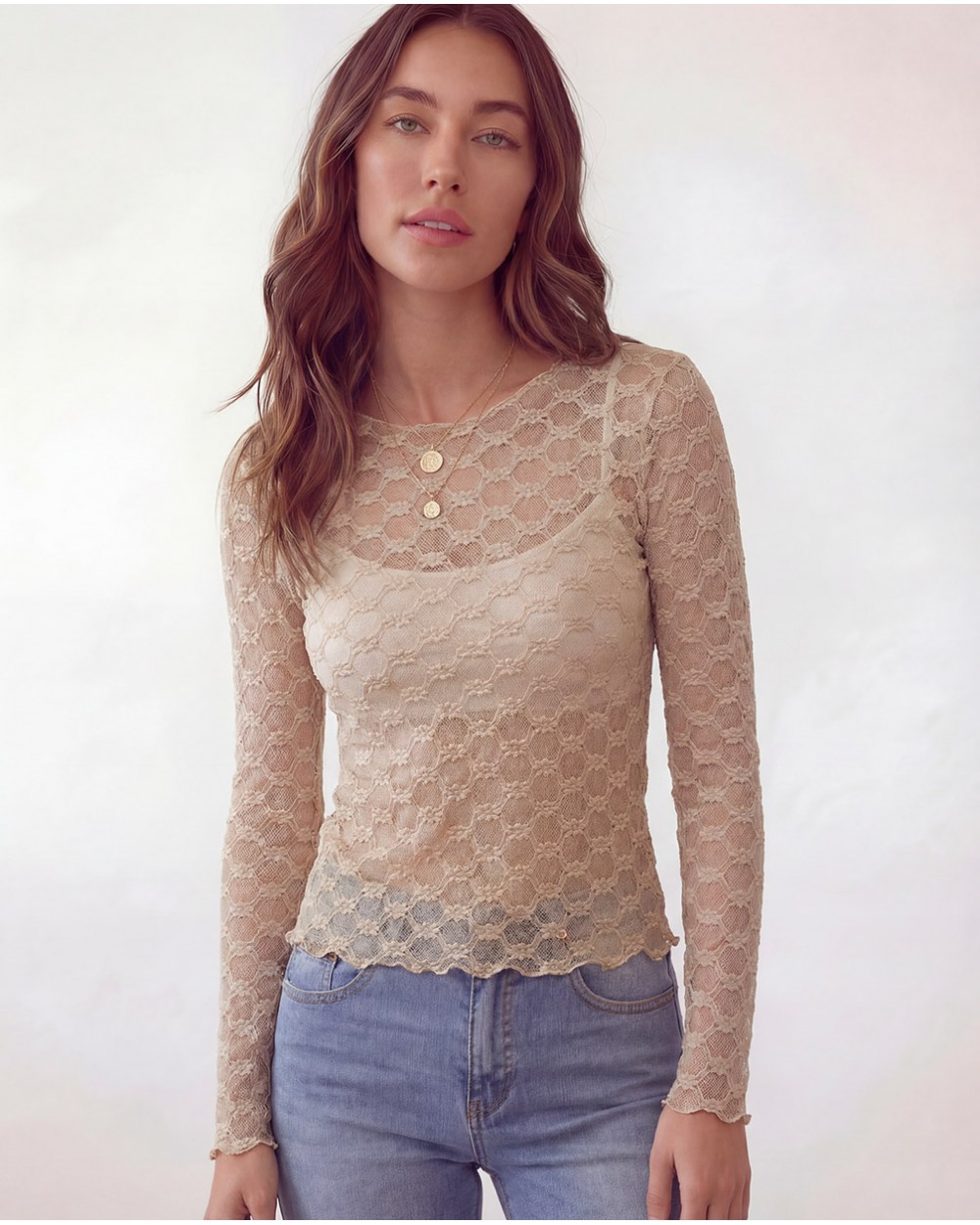 Maglia semitrasparente con collo rotondo e maniche lunghe. Dettaglio di ricami.