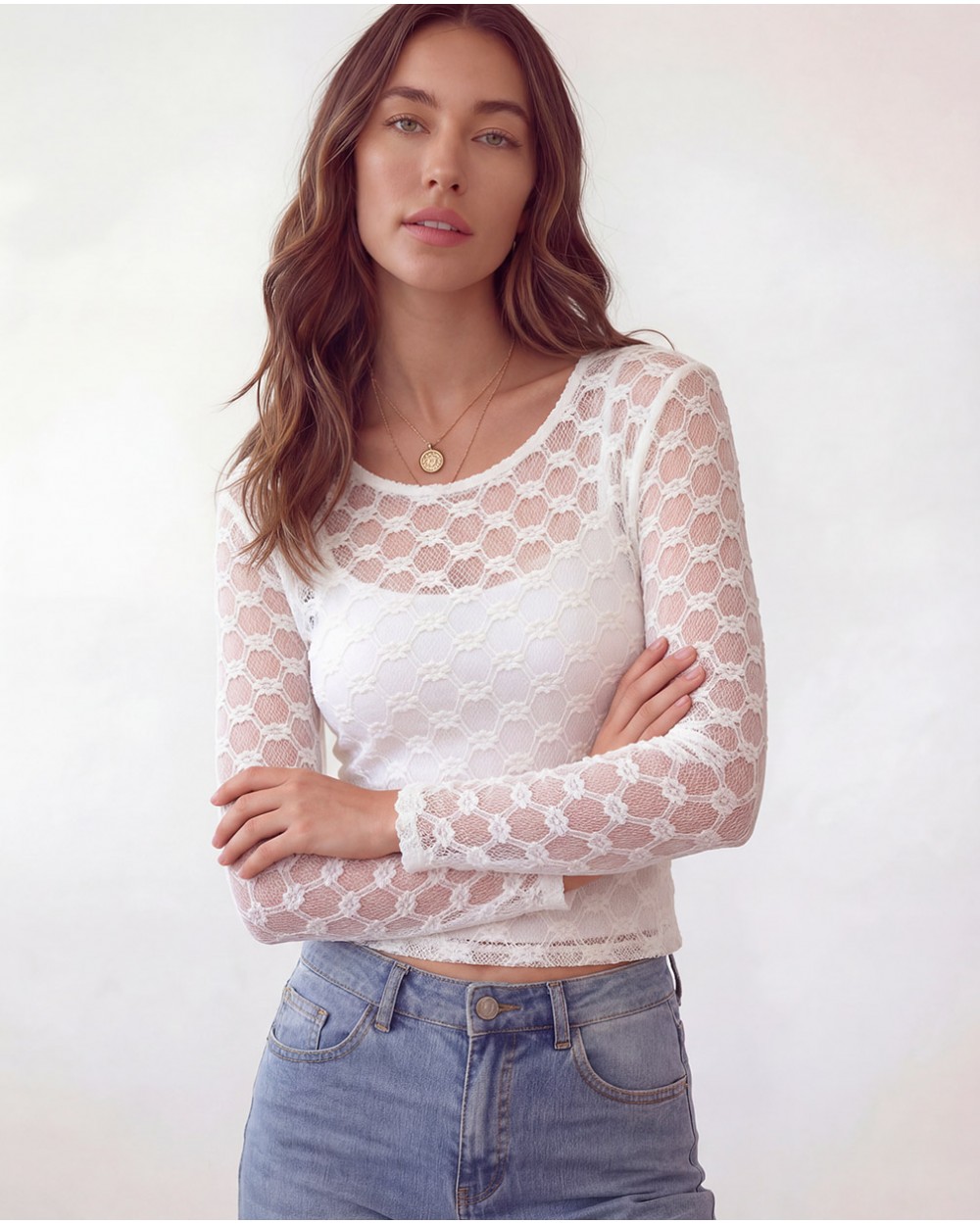 Maglia semitrasparente con collo rotondo e maniche lunghe. Dettaglio di ricami.
