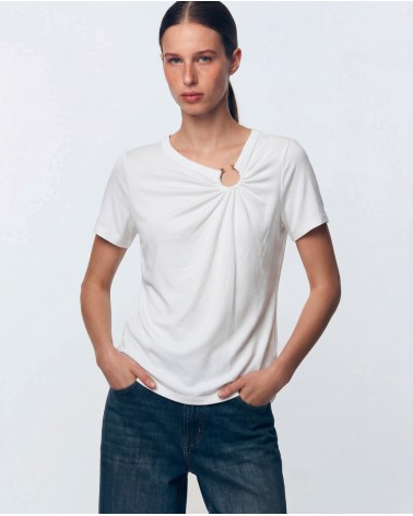 Maglia con collo rotondo e maniche corte. Dettaglio di apertura e arricciature.