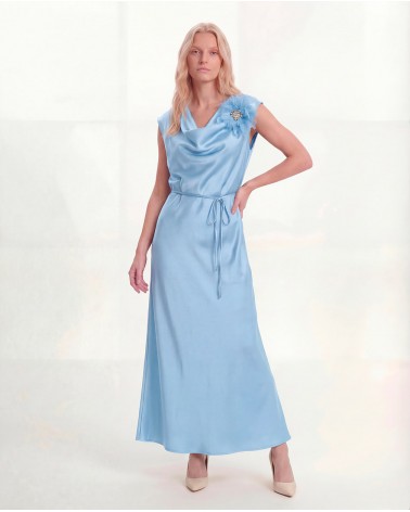 Vestito maxi effetto raso. Scollo morbido e giromaniche. Vita regolabile con cintura sottile dello stesso tessuto. Dettaglio di spilla con piume e strass.