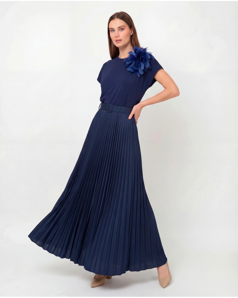 Vestito maxi realizzato in tessuto elasticizzato. Collo rotondo e mezze maniche. Vita elasticizzata. Cintura inclusa. Dettaglio di spilla con piume. Parte inferiore plissettata.