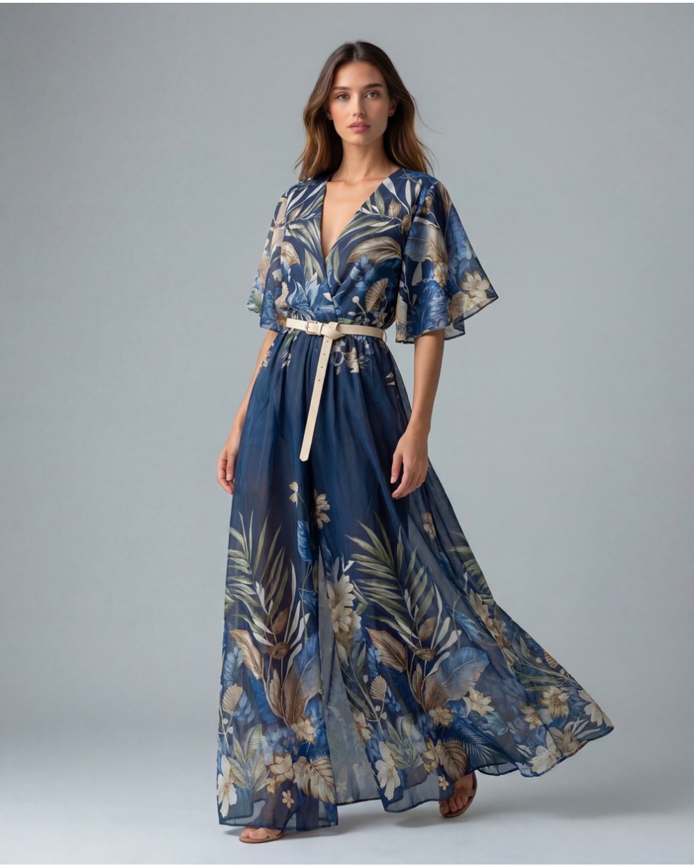 Vestito maxi con fantasia floreale. Scollo a v incrociato e maniche corte a palloncino. Vita elasticizzata. Cintura inclusa. Fodera interna.