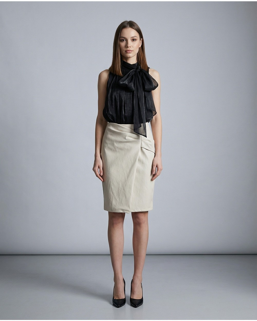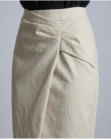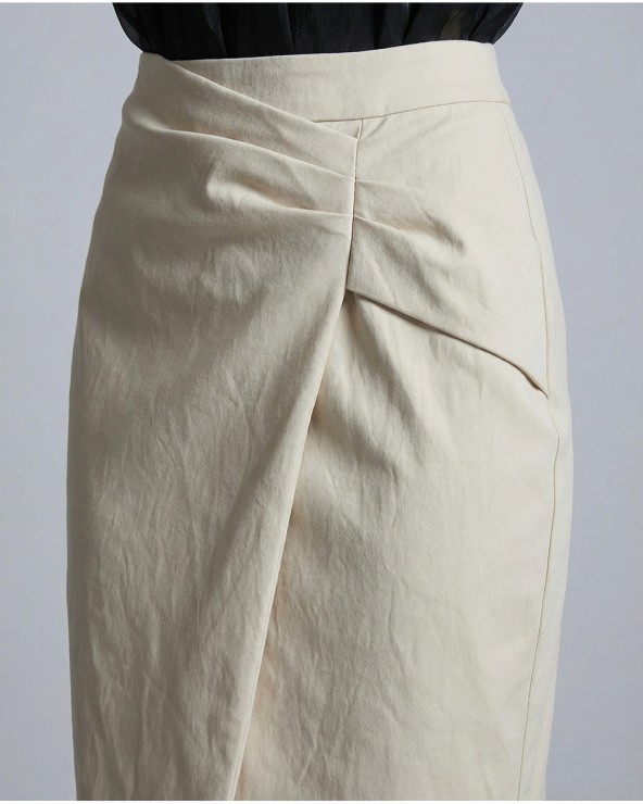 Gonna midi in ecopelle. Chiusura posteriore con cerniera a scomparsa. Dettaglio di arricciature e spacco sul davanti. Pinces sulla parte posteriore.