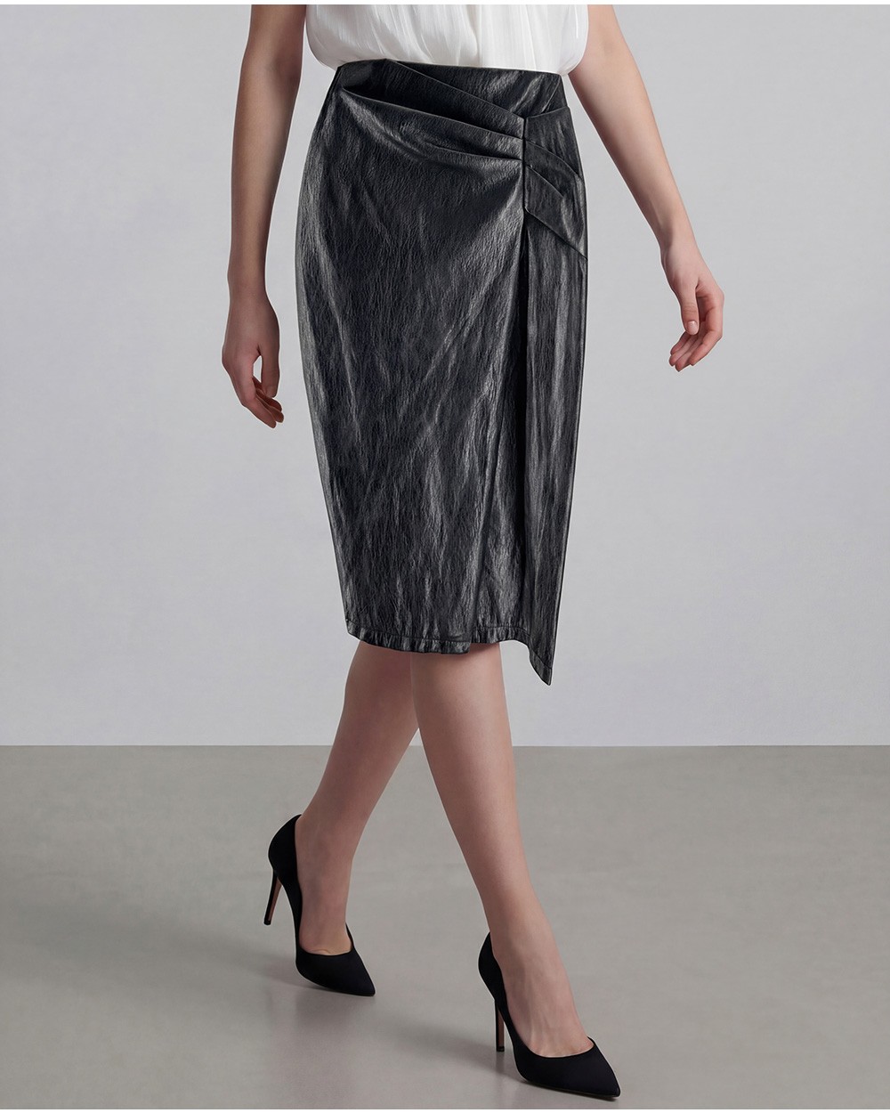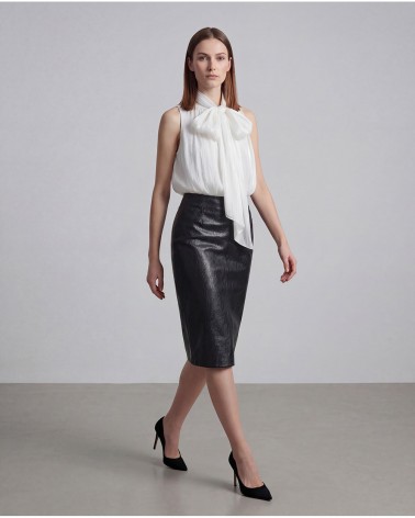 Gonna midi in ecopelle. Chiusura posteriore con cerniera a scomparsa. Dettaglio di arricciature e spacco sul davanti. Pinces sulla parte posteriore.