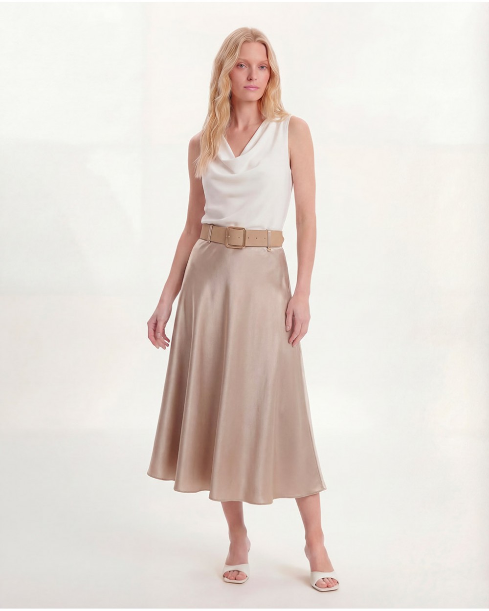 Gonna midi effetto raso. Vita elasticizzata sulla parte posteriore. Dettaglio di cintura inclusa. Tasche laterali.